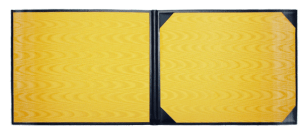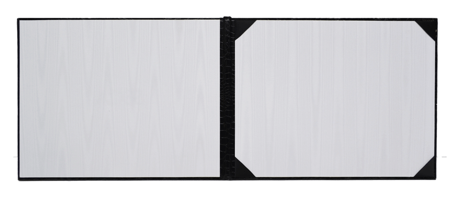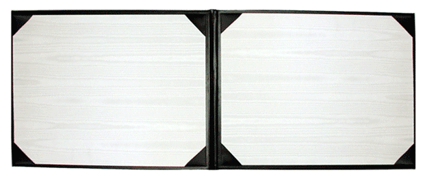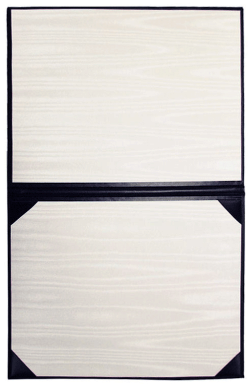 Made of foam-padded, heat sealed premium Castillian vinyl, with a black vinyl moiré lining. 11 1/2" x 8 7/8",